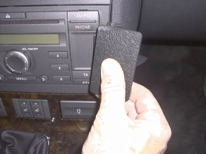 Peel off the adhesive tape covers on the ProClip. Place the ProClip as shown on the picture so the left part with adhesive tape is between the buttons in the control panel (do not attach the adhesive tape yet.) Press the grooved edge of the ProClip into the gap between the control panel and the surrounding frame. Start by pressing forwards on the upper part of the ProClip.