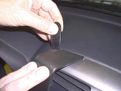 Press forwards on the upper part of the ProClip so the angled edge hooks into the gap between the frame surrounding the control panel and the dashboard. Press the gap opener into the gap next to the ProClip and prize carfully so the gap is widened. Press downwards on top of the ProClip so it goes all the way into the gap. Pull out the gap opener. Retighten the screws.