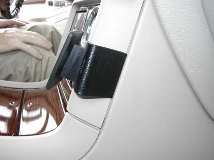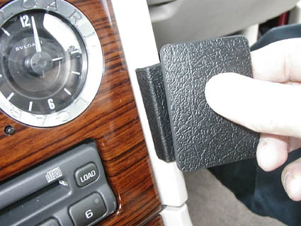 Peel off the cover of the adhesive tape on the ProClip. Place the angled edge on the left side of the ProClip over the console edge.