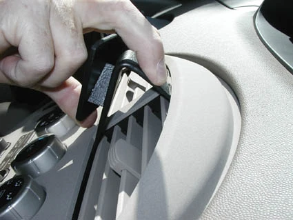 Peel off the cover of the adhesive tape on the ProClip. Place the curved edges on the lower part of the ProClip into the air vent and press the edges further into the gap between the inside-air vent "house" and the center console panel frame.