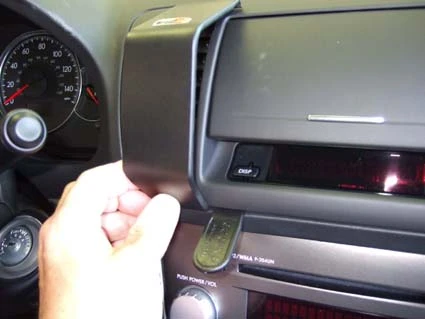 Press the thin end of the enclosed gap opener into the gap between the panel surrounding the air vent and the padded part of the dashboard, to widen the gap. Press the grooved edge on the lower part of the ProClip into the gap next to the gap opener. Press until you see or hear/feel it snaps into place. Pull out the gap opener.