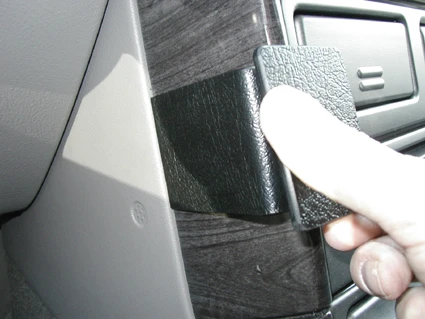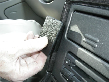 Peel off the cover of the adhesive tape on the ProClip. Place the angled edge on the right side of the ProClip over the console edge.