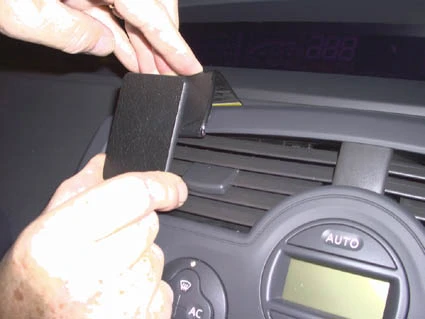 Peel off both adhesive tape covers on the ProClip. Hook the angled edge on the ProClip into the gap between the dashboard and the frame surrounding the air vent.