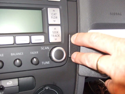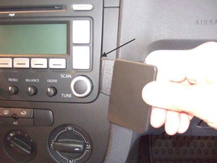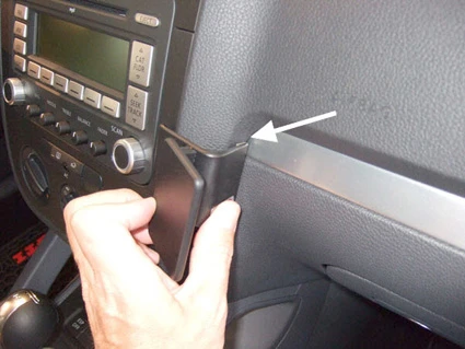Place your hand on the right side of the ProClip and push it towards the stereo so the angled edge on the left side goes into the gap between the stereo and the center console panel frame. Press until you see or hear/feel it click into place. NOTE: the angled edge goes into the gap by the stereo (see arrow in picture).