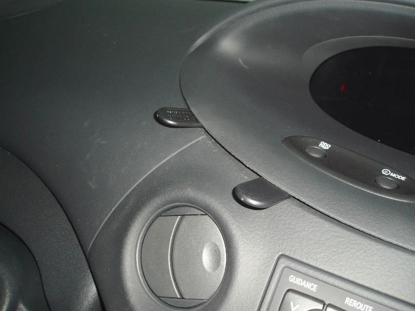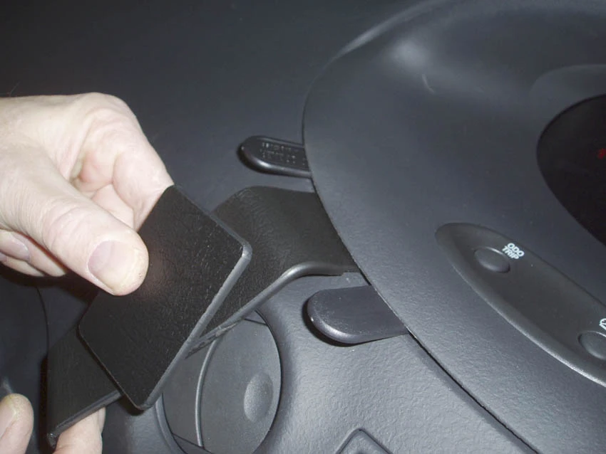 Press the thin end of the enclosed gap opener into the gap between the frame surrounding the display and the dasboard, to widen the gap. Peel off the cover of the adhesive tape on the ProClip.