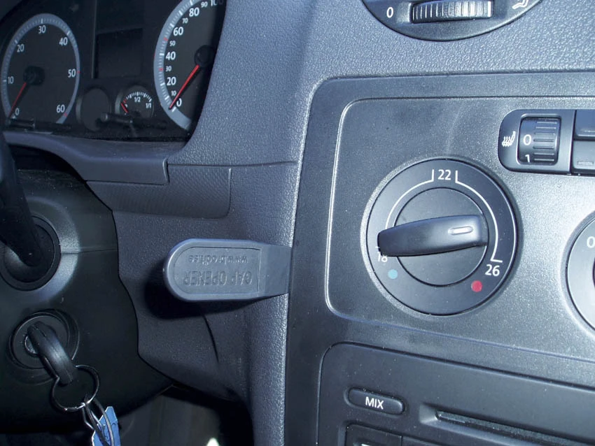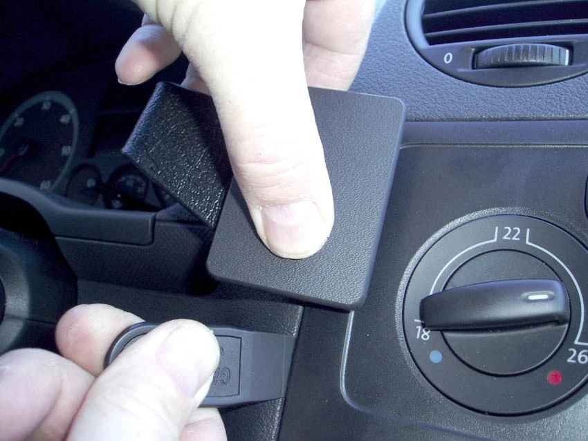 Press the curved edge on the right end of the ProClip into the gap above the gap opener. Flip the left side of the ProClip towards the dashboard so the curved edge on the right part hooks behind the frame surrounding the control panel. Pull out the gap opener.