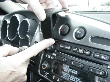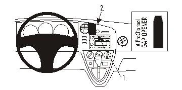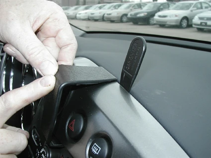 Press the gap opener into the gap between the dashboard and the center panel frame. Press firmly forward on the upper part of the ProClip so the angled edge goes into the gap next to the gap opener. Press until you see or hear/feel it snaps into place. Pull out the gap opener.