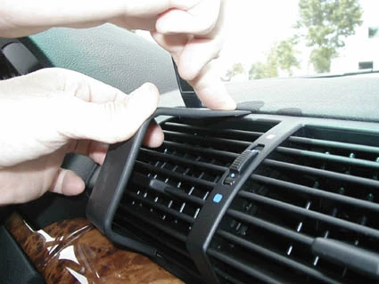 Press the thin end of the enclosed gap opener into the gap between the air vent panel frame and the padded dashboard, to widen the gap. Peel off the cover of the adhesive tape on the ProClip.