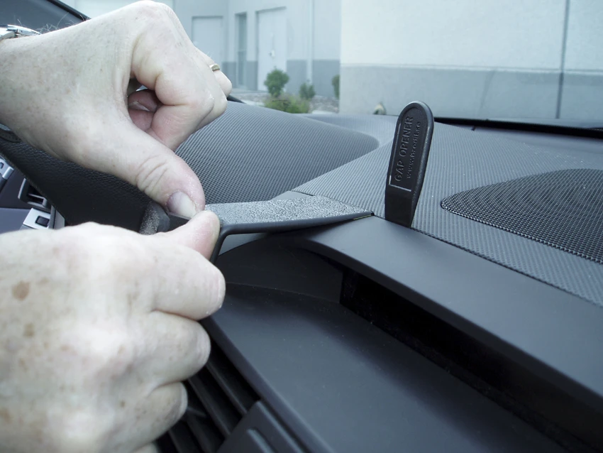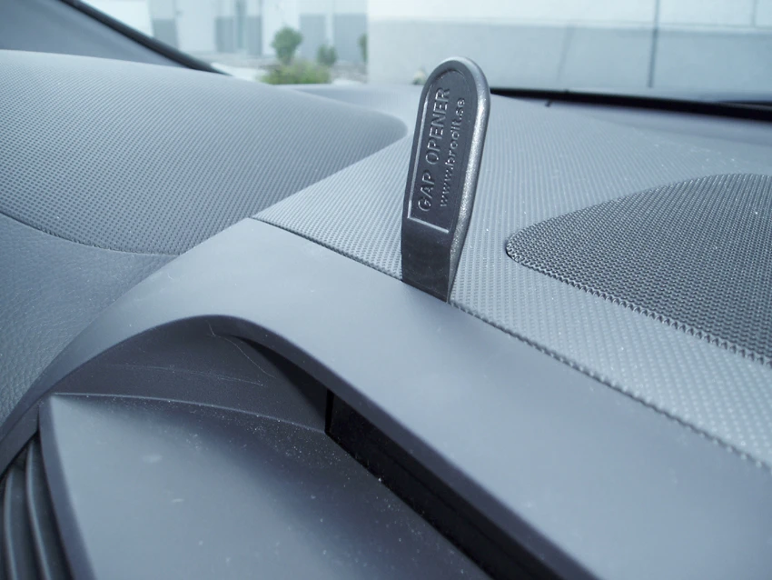 Press the thin end of the enclosed gap opener into the gap between the center console panel frame and the dashboard, to widen the gap.
