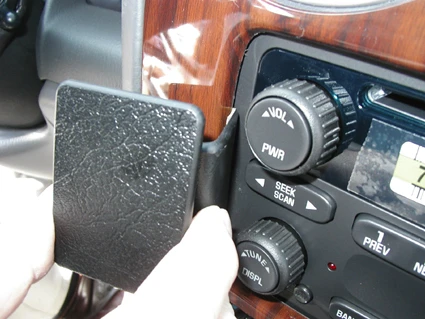 Peel off the cover of the adhesive tape on the ProClip . Press/hook the angled edge on the right side of the ProClip into the gap between the stereo and the surrounding panel frame.