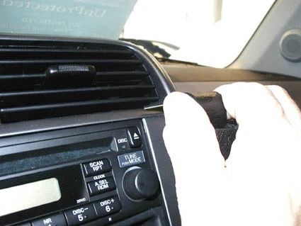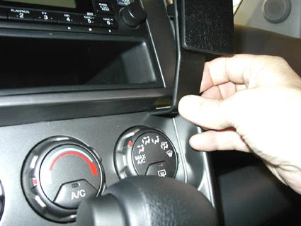 Peel off the adhesive tape covers on the ProClip. Press the lower part of the ProClip into the gap between the climate control panel and the surrounding frame. 2 Pull the upper part of the ProClip upwards and hook the upper edge into the lower part of the air vent.
