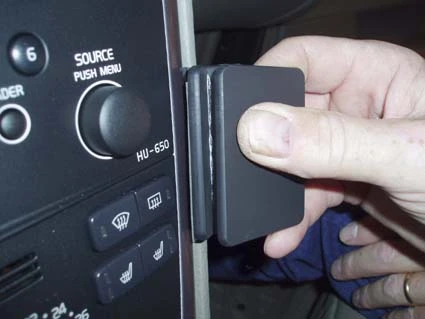 Peel off the adhesive tape covers on the ProClip. Press the grooved edge of the ProClip into the gap between the frame surrounding the control panel and the dashboard.