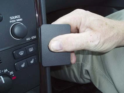 Peel off the adhesive tape covers on the ProClip. Press the grooved edge of the ProClip into the gap between the frame surrounding the control panel and the dashboard.