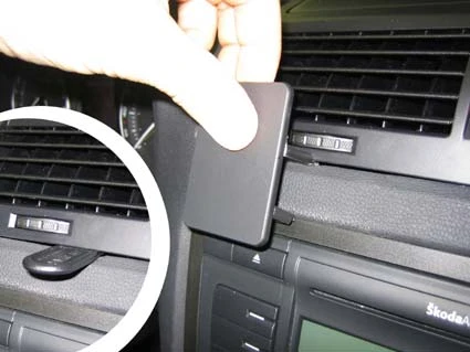 Press the thin end of the enclosed gap opener into the gap between the frame surrounding the air vent and the dashboard, to widen the gap. Peel off the cover of the adhesive tape on the ProClip. Press the upper part of the ProClip, with adhesive tape, into the gap next the gap opener. Pull out the gap opener.