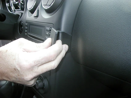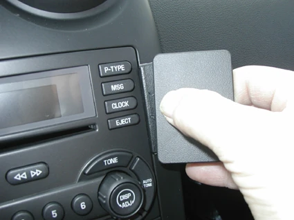 Peel off the cover of adhesive tape on the ProClip. Press the angled edge on the left side of the ProClip into the gap between the stereo and the surrounding panel frame.