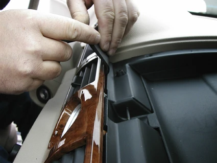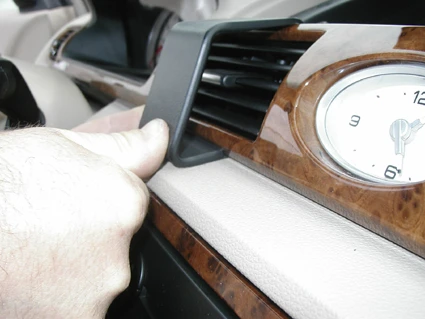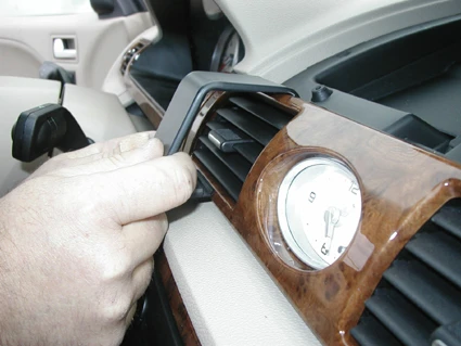Press firmly forward on the lower part of the ProClip so the grooved edge goes into the gap between the padded ledge and the air vent panel frame. Press until you see or hear/feel it snaps into place.