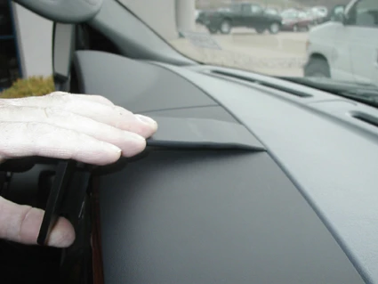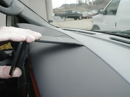 Peel off the cover of adhesive tape on the ProClip. Hook the angled edge on the upper part of the ProClip into the gap between the two panel sections on the dashboard.