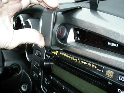 Press the thin end with adhesive tape on the lower part of the ProClip into the gap between the stereo and the center console panel frame.