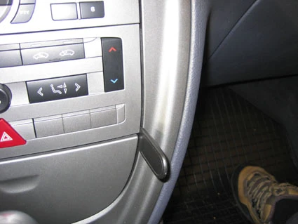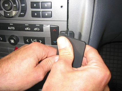 Press the thin end of the enclosed gap opener into the gap between the control panel and the surrounding frame, to widen the gap. Align the gap opener with the gap in the control panel, as shown in the picture. Peel off the adhesive tape covers on the ProClip.