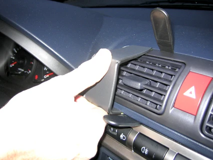 Press the thin ends of the enclosed gap openers into the gap between the frame surrounding the air vent and the dashboard one above and one below the air vent, to widen the gap. Peel off the cover of the adhesive tape on the ProClip. Press the lower part of the ProClip into the gap next to the gap opener.