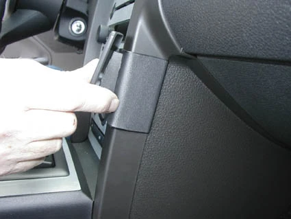 Peel off the cover of adhesive tape on the ProClip. Place the ProClip over the console edge and press the left side of the ProClip towards the console edge so the adhesive attaches properly.