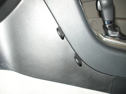 Press the thin end of the enclosed gap openers into the gap between the center console panel frame and the console edge, to widen the gap. Note: The gap is very tight. Peel off the cover of adhesive tape on the ProClip.