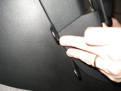 Place the ProClip over the consol edge and press the angled edge on the left side of the ProClip into the gap between the gap openers. Start by pressing in the upper corner and follow through downwards. The gap is very tight so you may have to press firmly and squeeze a little. Pull out the gap openers.