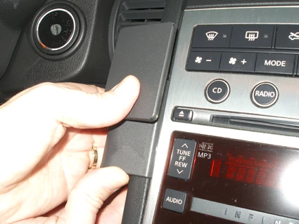 Slide the ProClip upwards while in the gap. As you slide it, the angled edge on the right side will go into the gap between the console edge and the center console panel frame. Push it all the way up so the bottom part of the face plate is aligned with the CD slot.