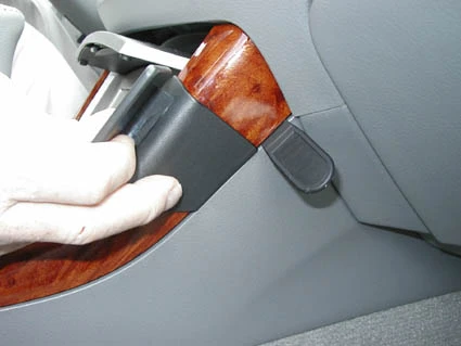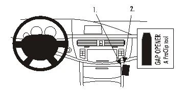 Press the thin end of the enclosed gap opener into the gap sidewall, to widen the gap. Open the door in the dashboard. Peel off the cover of adhesive tape on the ProClip.