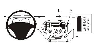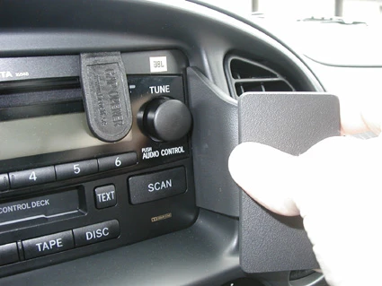 Press the thin end of the enclosed gap opener into the gap between the stereo and the center panel to widen the gap. Peel off the cover of adhesive tape on the ProClip.