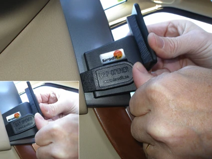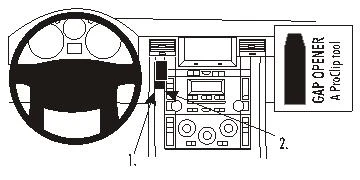 Peel off the cover of adhesive tape on the ProClip. Place the enclosed gap opener along the outside of the ProClip and press the thin end into the gap between the center console edge panel frame and the padded part of the dashboard, to widen the gap. While widening the gap with the gap opener: press firmly forward on the left side of ProClip so the angled edge goes into the gap and snaps behind the panel edge. Pull out the gap opener.