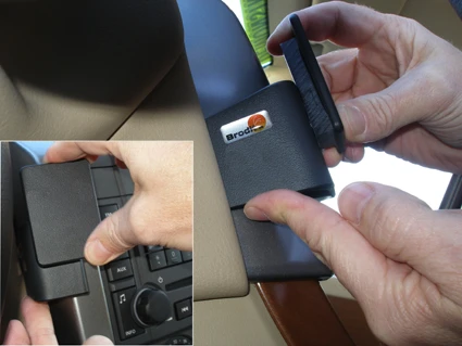 Place your thumbs on the left side of the ProClip and your finger in the groove between the panel sections and firmly press/push the ProClip towards the stereo so the angled edge on the right side snaps over the console edge and into the gap.
