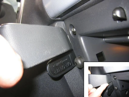 Open the glove compartment. Loosen the screw in the upper left corner of the glove compartment. Press the thin end of the enclosed gap opener into the gap between the glove compartment and the dashboard, to widen the gap. Peel off the cover of the adhesive tape on the ProClip.
