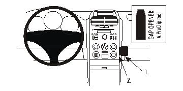 Press the thin end of the enclosed gap opener into the gap between the control panel and the surrounding frame, to widen the gap. Peel off the adhesive tape covers on the ProClip. Open the glove compartment.