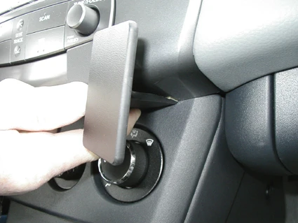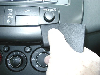 Peel off the cover of adhesive tape on the ProClip. Press the angled edge on the upper part of the ProClip into the gap between stereo control panel and the surrounding panel frame.