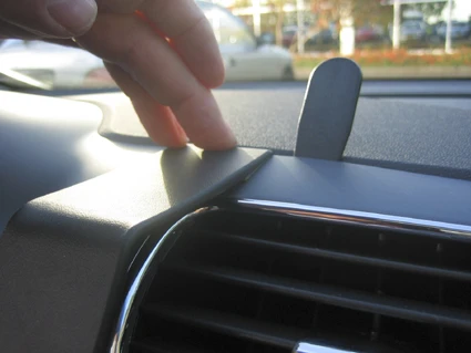 Press the thin end of the enclosed gap opener into the gap between the air vent frame and the dashboard, to widen the gap. Peel off the adhesive tape covers on the ProClip.