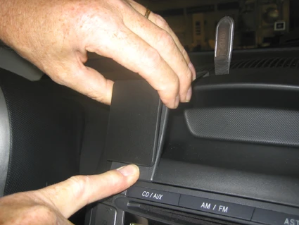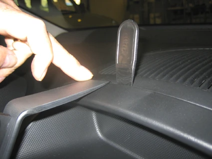 Press the thin end of the enclosed gap opener into the gap between the control panel and the dashboard, to widen the gap. Peel off the adhesive tape covers on the ProClip. Press the angled edge on the lower part of the ProClip into the gap between the stereo and the surrounding panel.