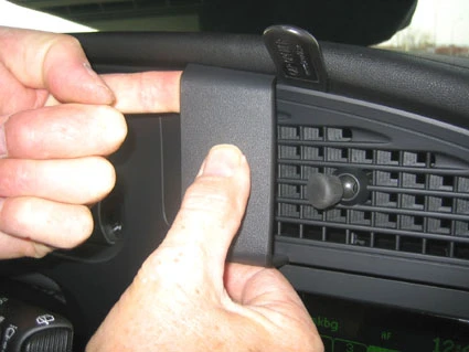 Flip the ProClip upwards so the curved lower edge hooks behind the stereo. Pull out the gap opener. Press the gap opener into the gap between the panel surrounding the air vent and the dashboard.