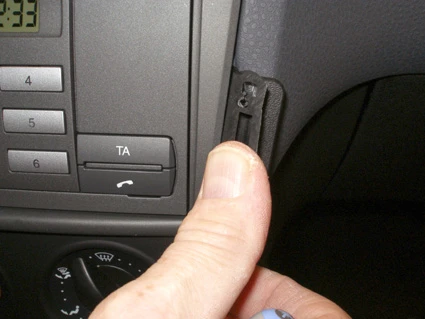 Use the enclosed alcohol pad to clean the surface of the area where the ProClip is to be installed. Press the thin end of the enclosed gap opener into the gap between the dashboard and the frame surrounding the control panel, to widen the gap. Peel off the adhesive tape cover on Part 1. Press the angled edge on Part 1 into the gap next to the gap opener.