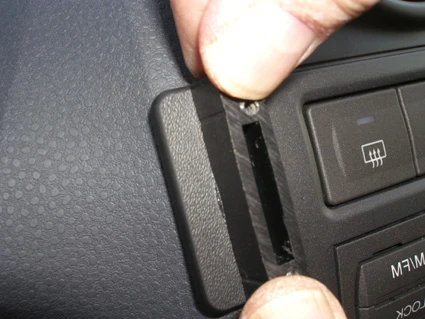 Use the enclosed alcohol pad to clean the surface of the area where the ProClip is to be installed. Peel off the adhesive tape cover on Part 1. Press the angled edge on Part 1 into the gap between the dashboard and the frame surrounding the control panel.