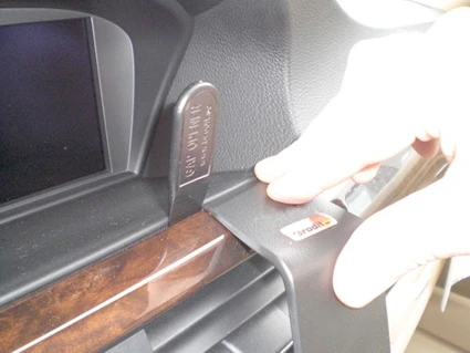 Press a gap opener firmly into the gap between the wood grain trim and the dashboard ledge, to widen the gap. Press forward on the ProClip so the angled upper edge hooks into the gap. Press firmly down on the top left corner of the ProClip to make sure the angled edge is all the way into the gap. Press until you see or hear/feel it click into place.