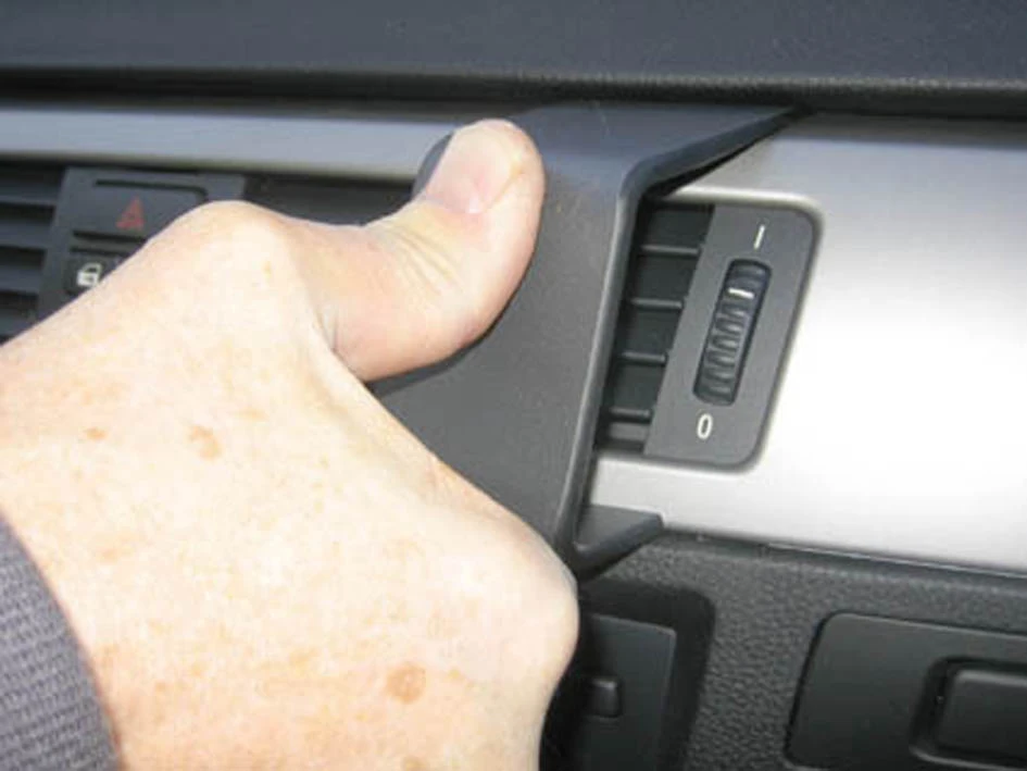Press forward on the upper part of the ProClip so the angled edge snaps over the wood grain trim and into the gap between the trim and the padded part of the dashboard. Press until you see or hear/feel it snaps into place. Pull out the gap openers