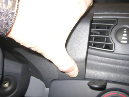 Press the thin end of the enclosed gap opener into the gap between the control panel and the dashboard, to widen the gap. Peel off the adhesive tape covers on the ProClip. Press the curved edge on the lower part of the ProClip into the gap next to the gap opener.