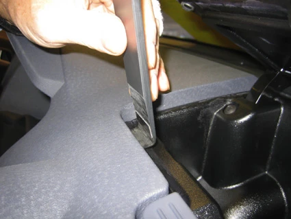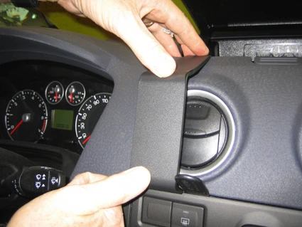 Press the curved edge on the upper part of the ProClip into the gap between the coin compartment and the dashboard. Flip the ProClip downwards/forwards so the upper curved edge hooks under the coin compartment.