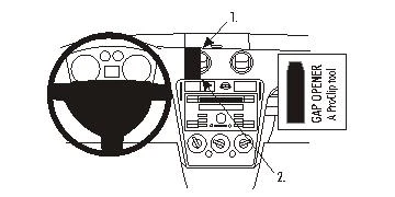 Press the thin end of the enclosed gap opener into the gap between the control panel and the dashboard, to widen the gap. Open the coin compartment on top of the dashboard. Peel off the cover of the adhesive tape on the ProClip.