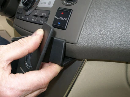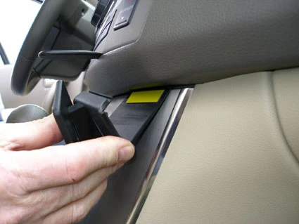 Flip the ProClip over so the inside is facing upwards. Press the angled edge on the lower part of the ProClip into the gap between the center console panel frame and the dashboard overhang.