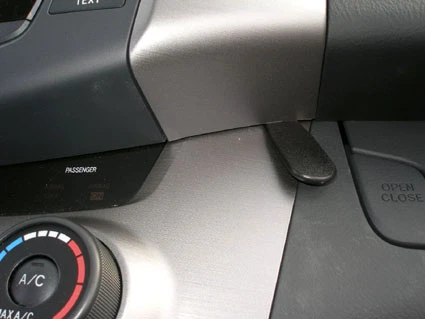 Press the thin end of the enclosed gap opener into the gap between the center console panel frame and the dashboard overhang, to widen the gap. Peel off the cover of adhesive tape on the ProClip.