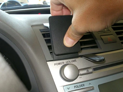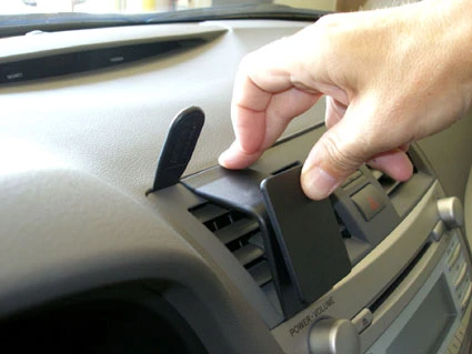 Press the thin end of both gap openers (on each side of the ProClip) into the gap between the padded dashboard and the air vent panel frame, to widen the gap. Press forward with your thumb on the upper part of the ProClip face plate, and down on the top left side of the ProClip with your long finger or index finger so the angled edge goes into the gap next to the gap opener. Press until you see or hear/feel it snaps into place.