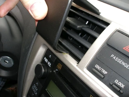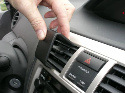 Peel off the cover of adhesive tape on the ProClip. Press the angled edge on the lower part of the ProClip into the seam/gap inside the air vent bottom and the surrounding panel frame.