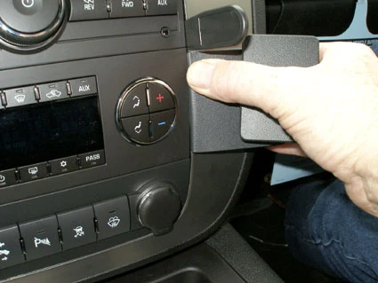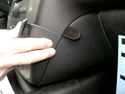 Press the gap opener into the seam/gap where it curves in the console sidewall. While inserted into the gap slide the gap opener down to where it meets the right side of the mount. Press firmly forward on the right side of the ProClip face plate so the angled edge goes into the gap below the gap opener. Press until you see or hear/feel it snaps into place. Pull out the gap opener.